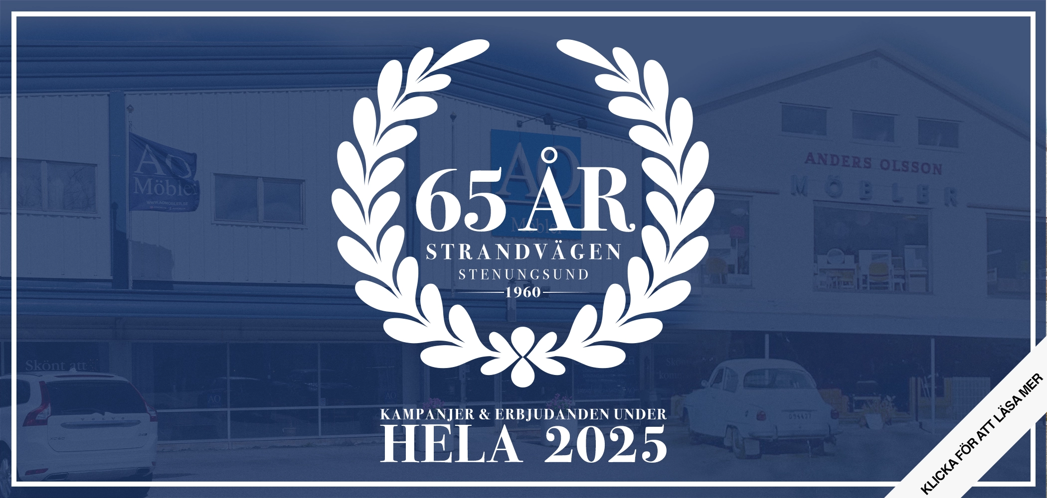 År 1960 slog vi upp dörrarna till vårt möbelvaruhus på Strandvägen 33 – och här står vi kvar än idag. I hela 65 år har AO Möbler varit en självklar mötesplats för alla som söker kvalitet, inspiration och personlig service när det gäller inredning och möbler.