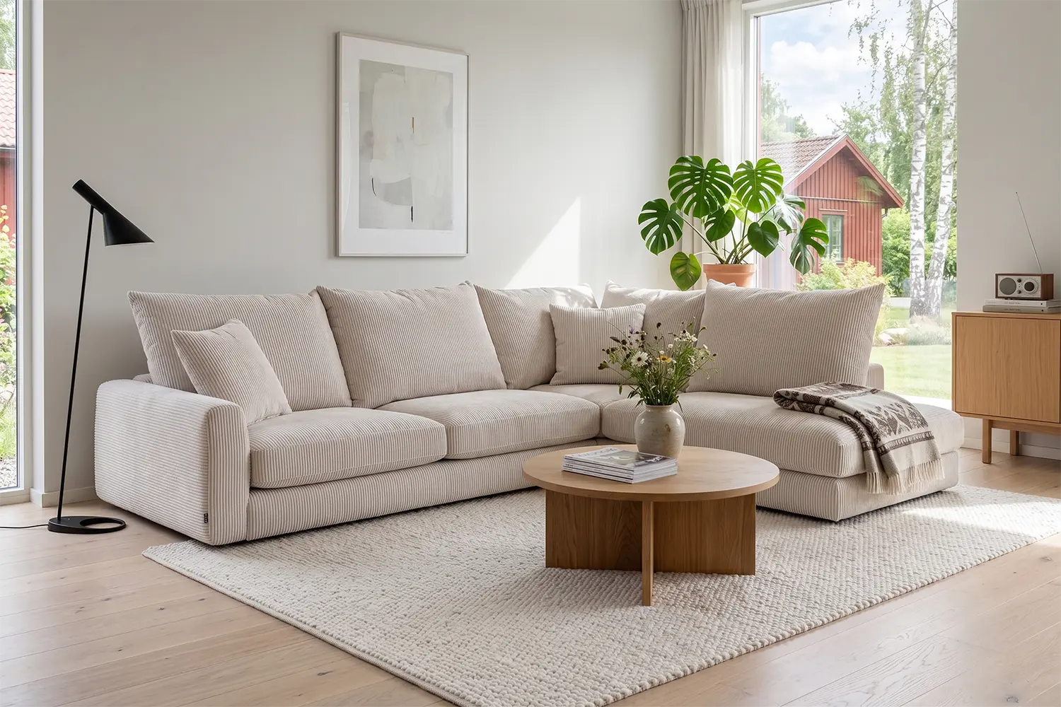 En stilren och bekväm hörnsoffa som snabbt blir hemmets naturliga samlingspunkt.