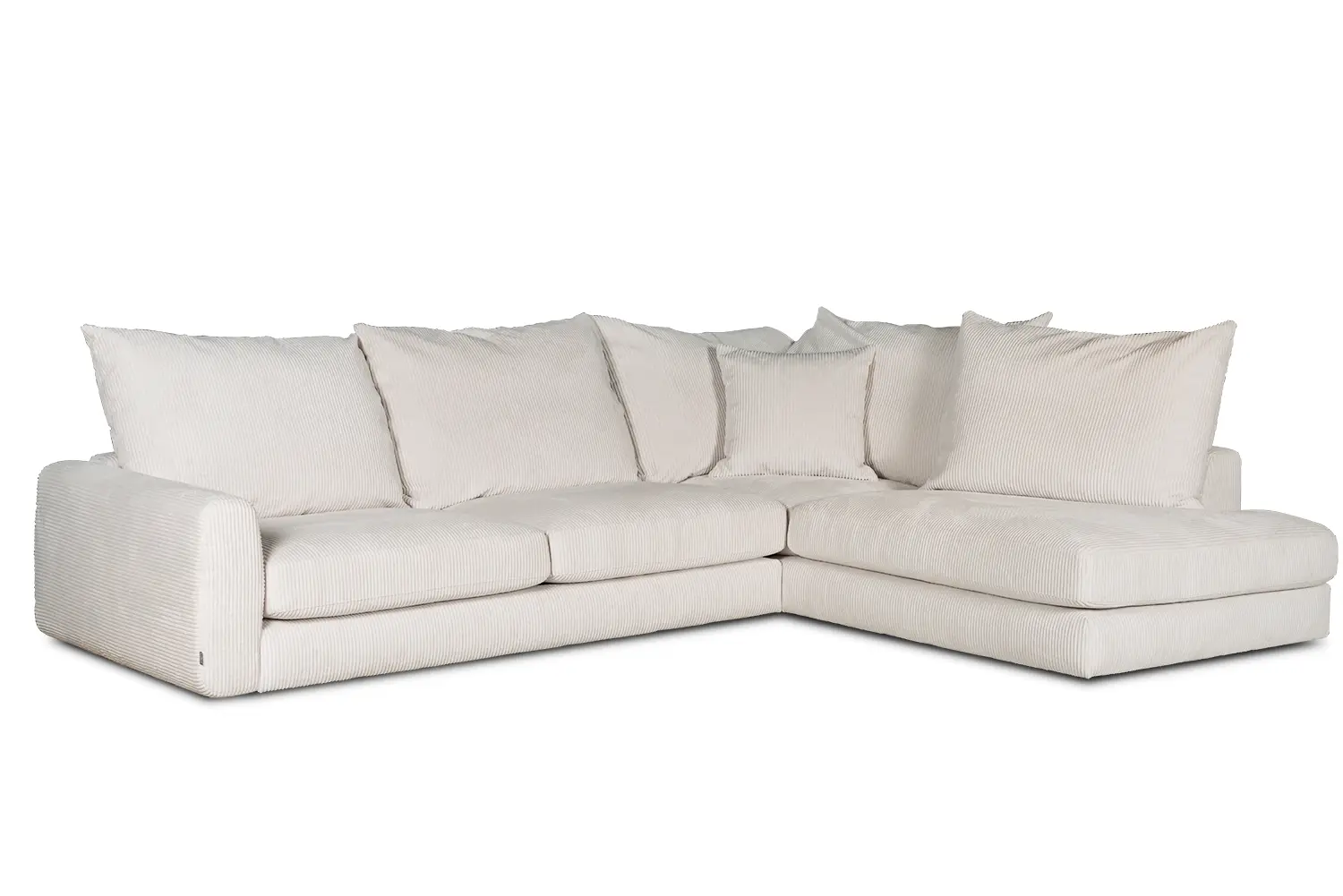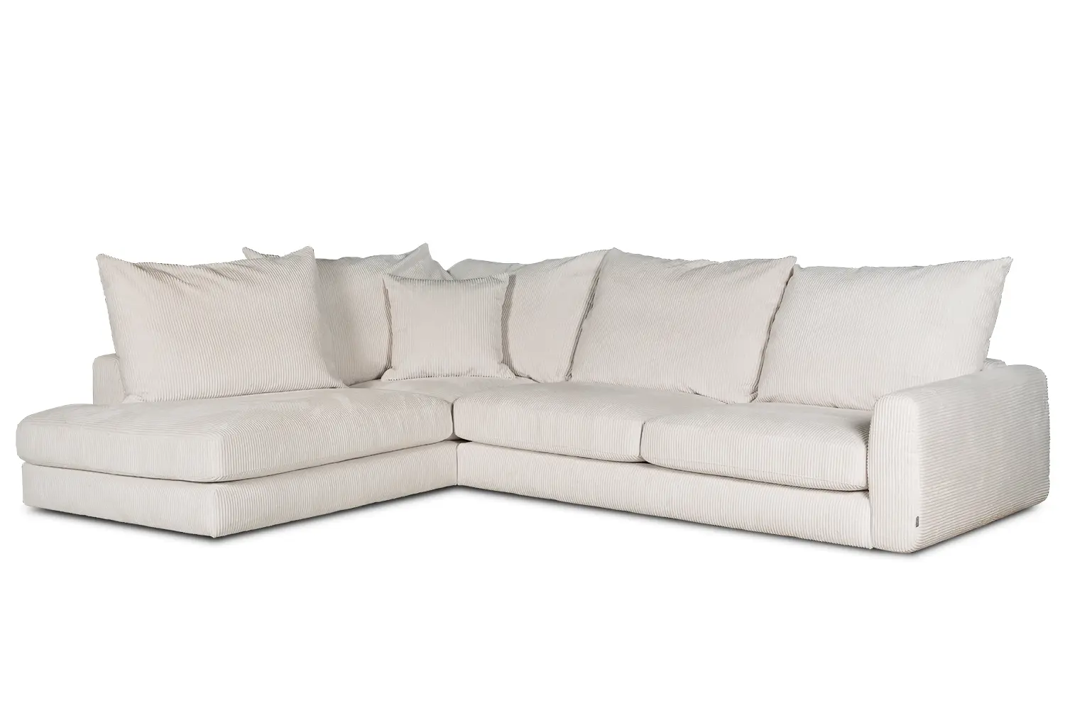 Elora hörnsoffa med öppet avslut ger luftig design och djup komfort – perfekt för avslappnade stunder och moderna vardagsrum.