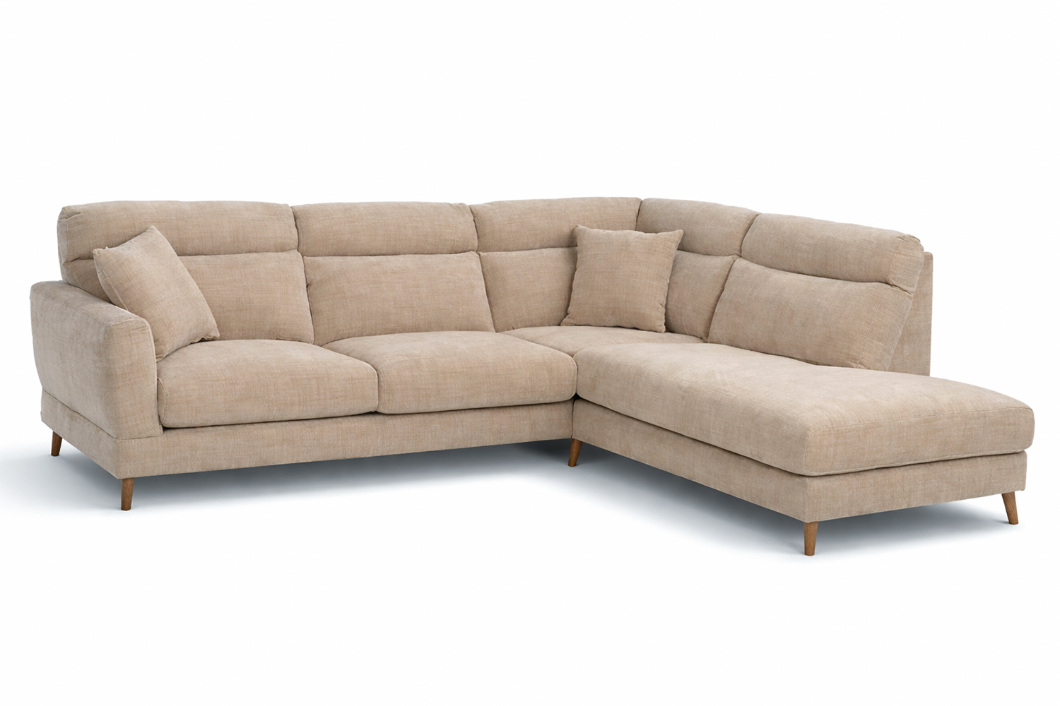 Soffan har ett öppet avslut som skapar en luftig och inbjudande känsla, samtidigt som den ger flexibilitet i möbleringen. Den något högre ryggen ger extra stöd och komfort, vilket gör soffan lika skön för långa filmkvällar som för sociala stunder.