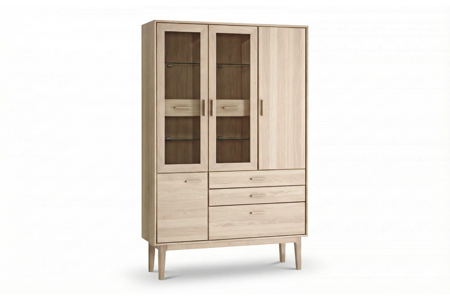 - Vitrindelen: Två eleganta glasdörrar döljer två flyttbara glashyllor vardera, samt en mindre låda bakom varje dörr – perfekt för bestick eller servettringar. (Belysning till glashyllorna kan köpas till separat för extra stämning).