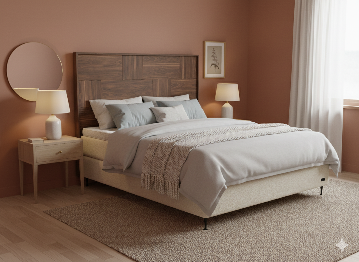 Elegant huvudgavel i valnöt med geometrisk paneldesign. Skapar en stilren, varm och exklusiv känsla i sovrummet.