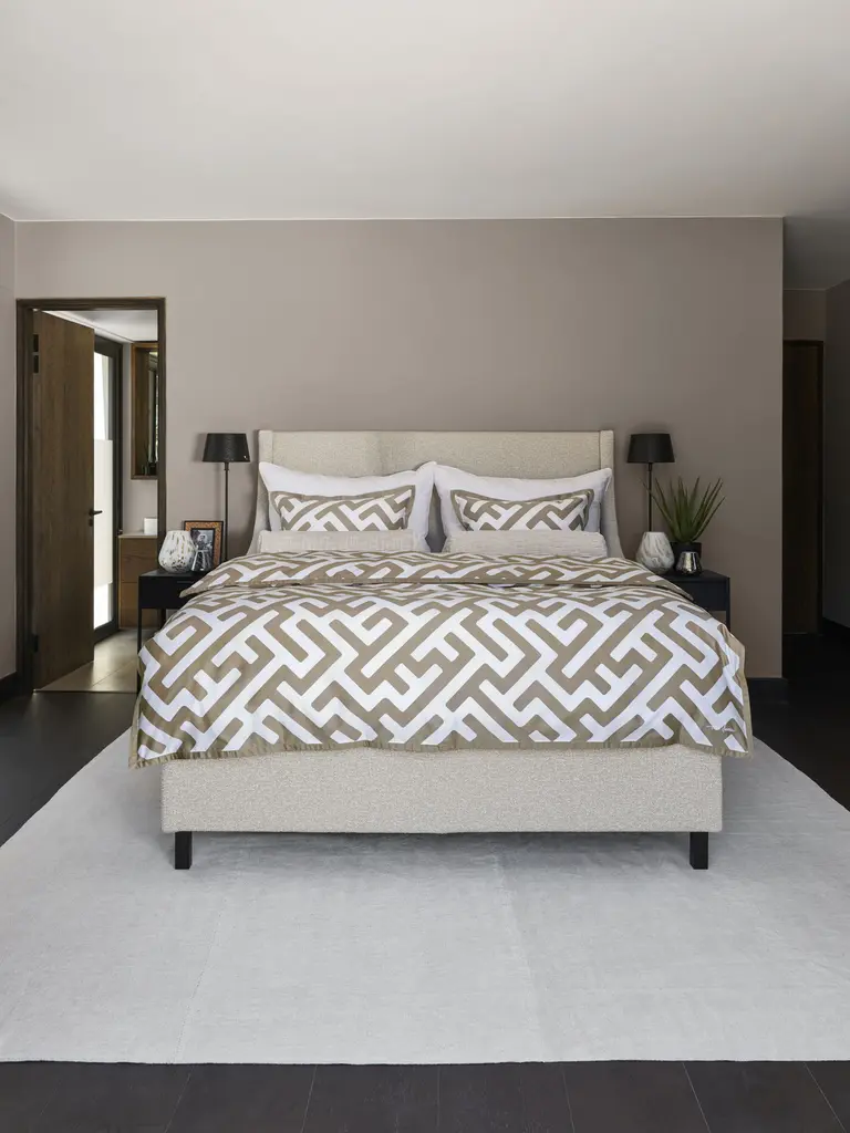Det grafiska mönstret spelar huvudrollen och ramas elegant in av en BEIGE kontrastkant, vilket ger bäddningen ett tydligt, exklusivt uttryck. Den lyxiga satinväven i bomull med trådtäthet TC 400 är silkeslen mot huden och skapar en sval, följsam känsla som gör sängen lika vacker att se på som fantastisk att sova i. Ett bäddset som verkligen förvandlar sovrummet till en plats för vila, stil och harmoni.