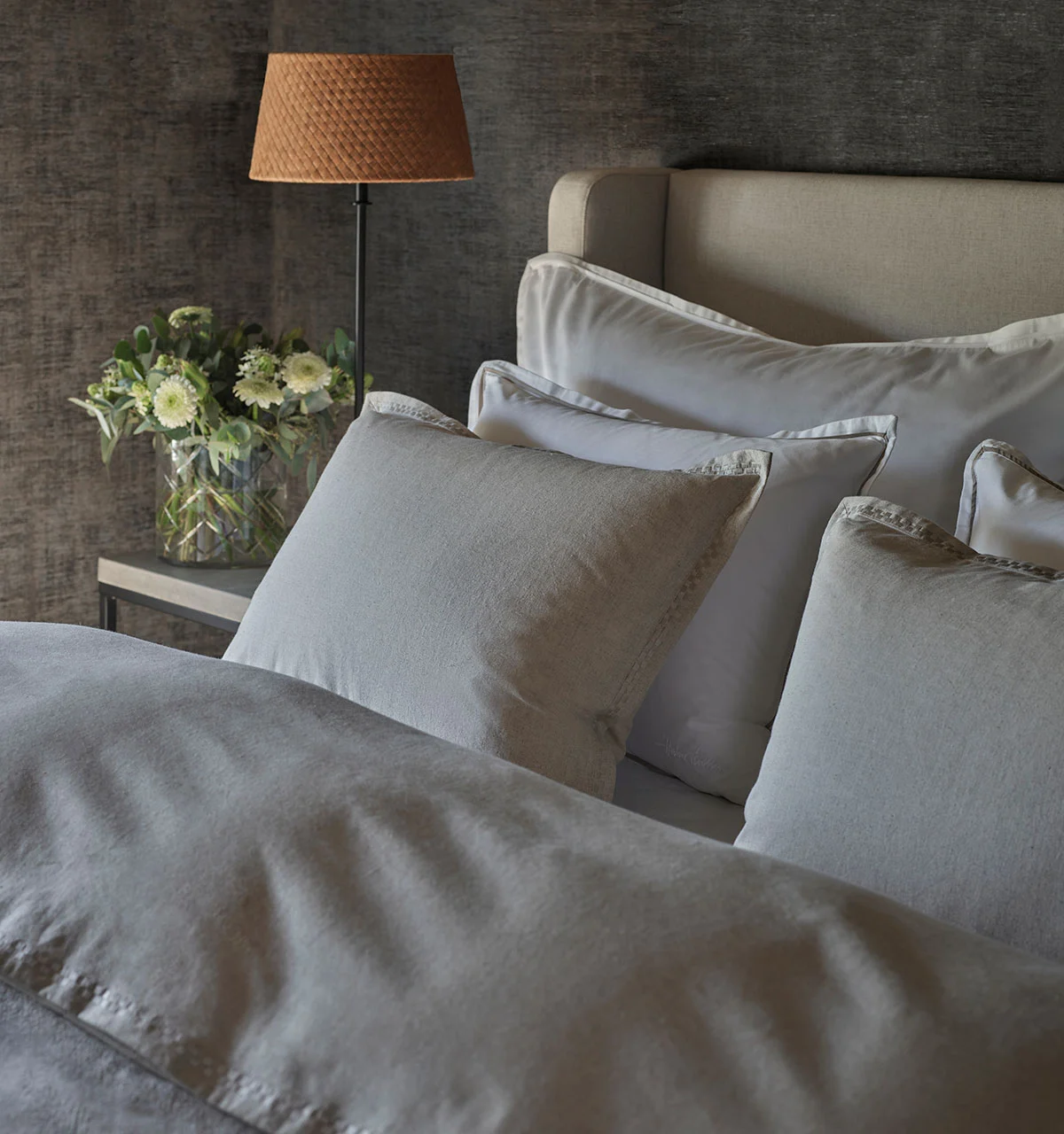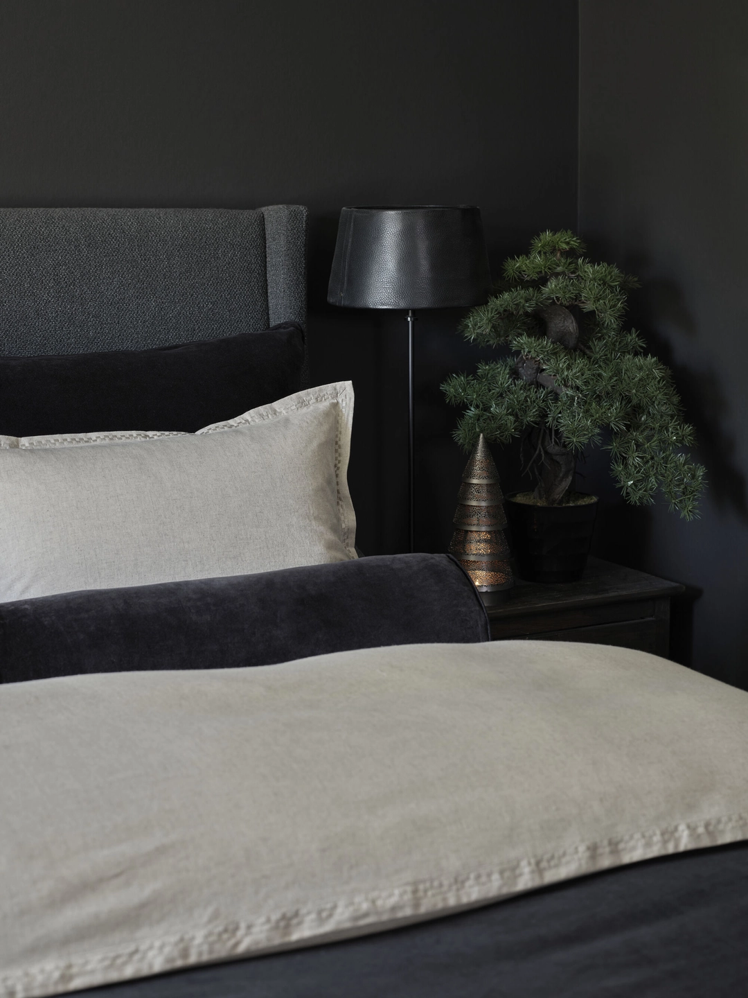 Linne har en särskild förmåga att framhäva kvaliteten i en bäddning. Det ger djup, taktilitet och en levande yta som skapar ett harmoniskt och genomarbetat sovrum. I Trae dämpas linnets naturliga veck något genom bomullsblandningen, vilket gör tyget mjukare mot huden samtidigt som de unika egenskaperna bevaras.