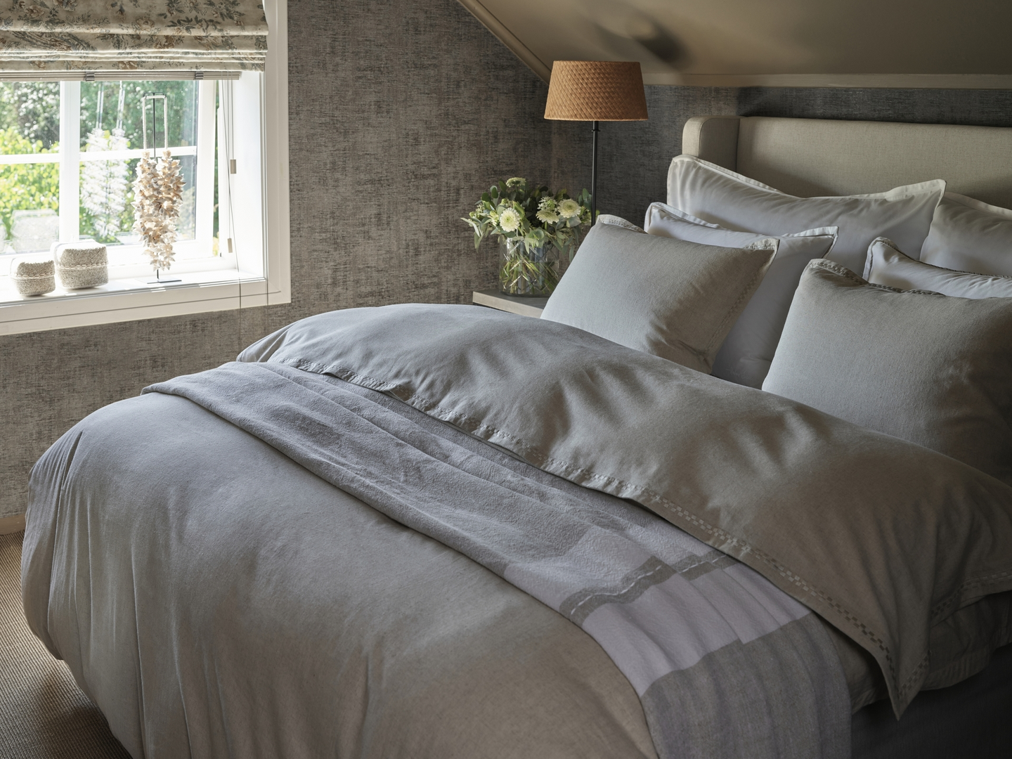 Det subtila ton-i-ton-broderiet på både påslakan och örngott lyfter fram den underliggande elegansen och förstärker det klassiska, tidlösa uttrycket. En detalj som inte skriker – men som märks.
