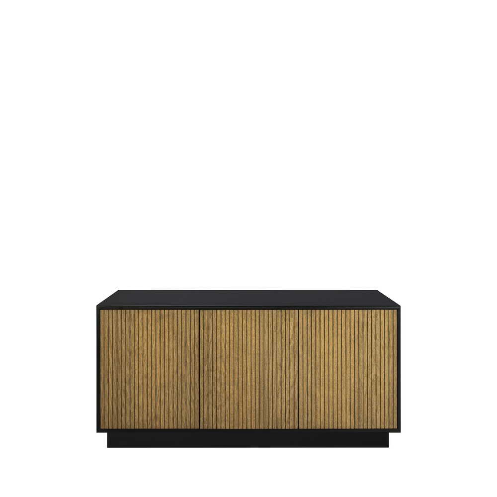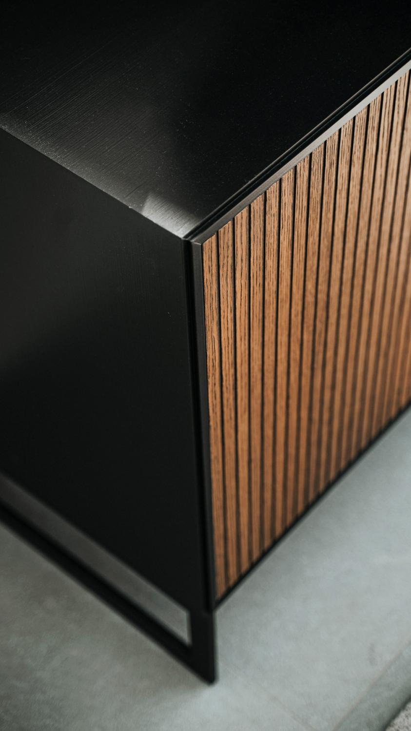 Line sideboard i bränd valnöt med benstativ eller sockel. Välj mellan svart eller vit stomme.