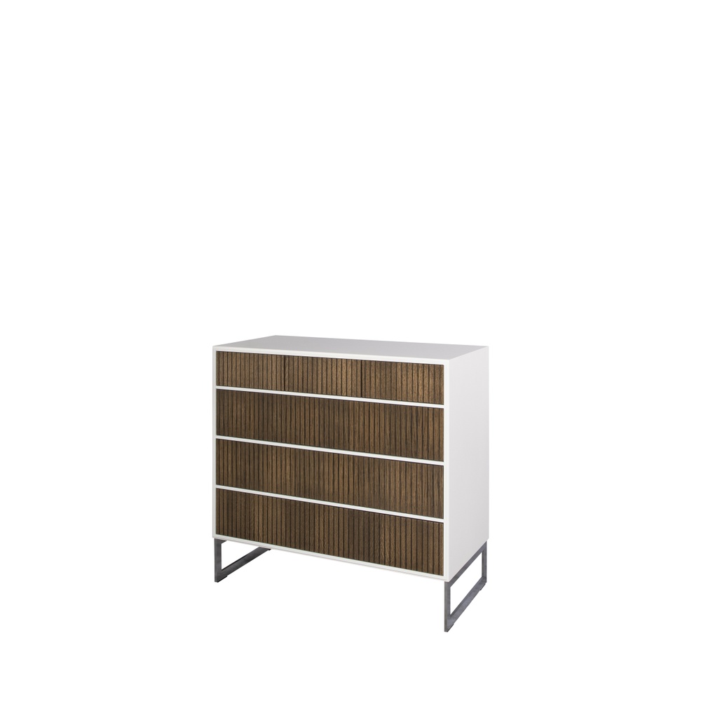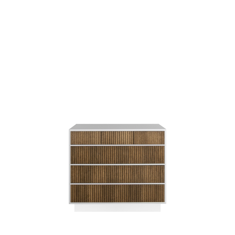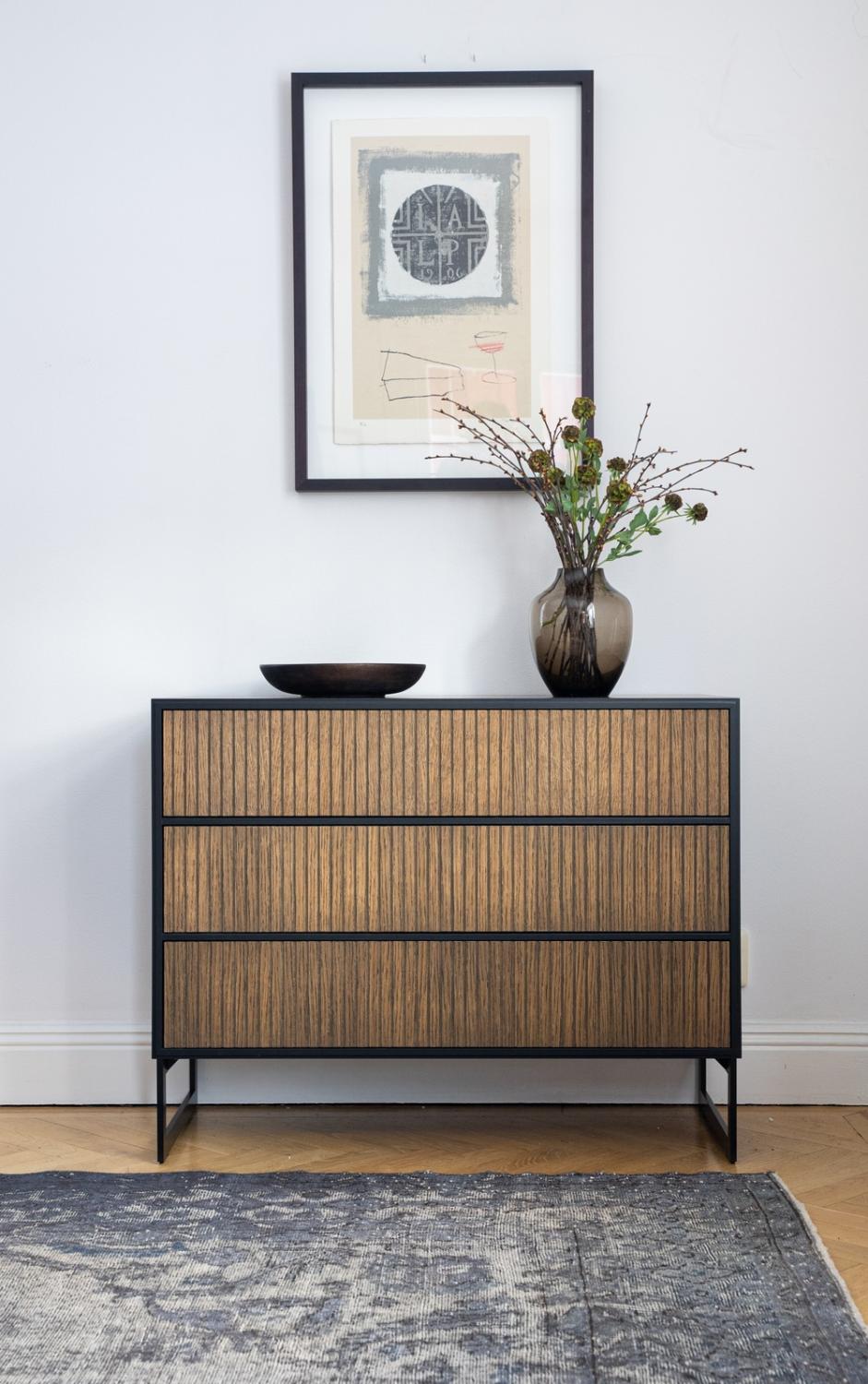 Line byrå i bränd valnöt med benstativ eller sockel. Välj mellan svart eller vit stomme.