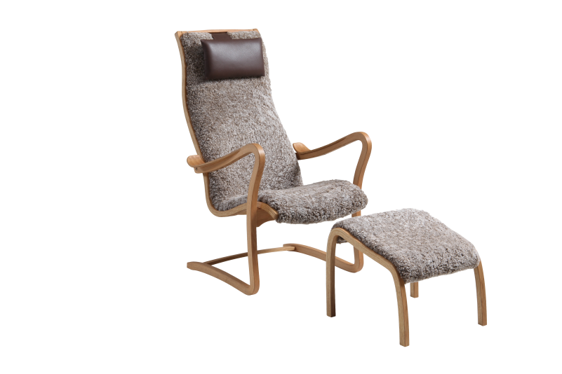 Majoren fåtölj inkl pall i fårskinn Grey, Koks eller Nougat, bakryggen i klädd naturfärgad linneväv, svartlinneväv på rygg mot tillägg. Trädetaljer i oljad ek.