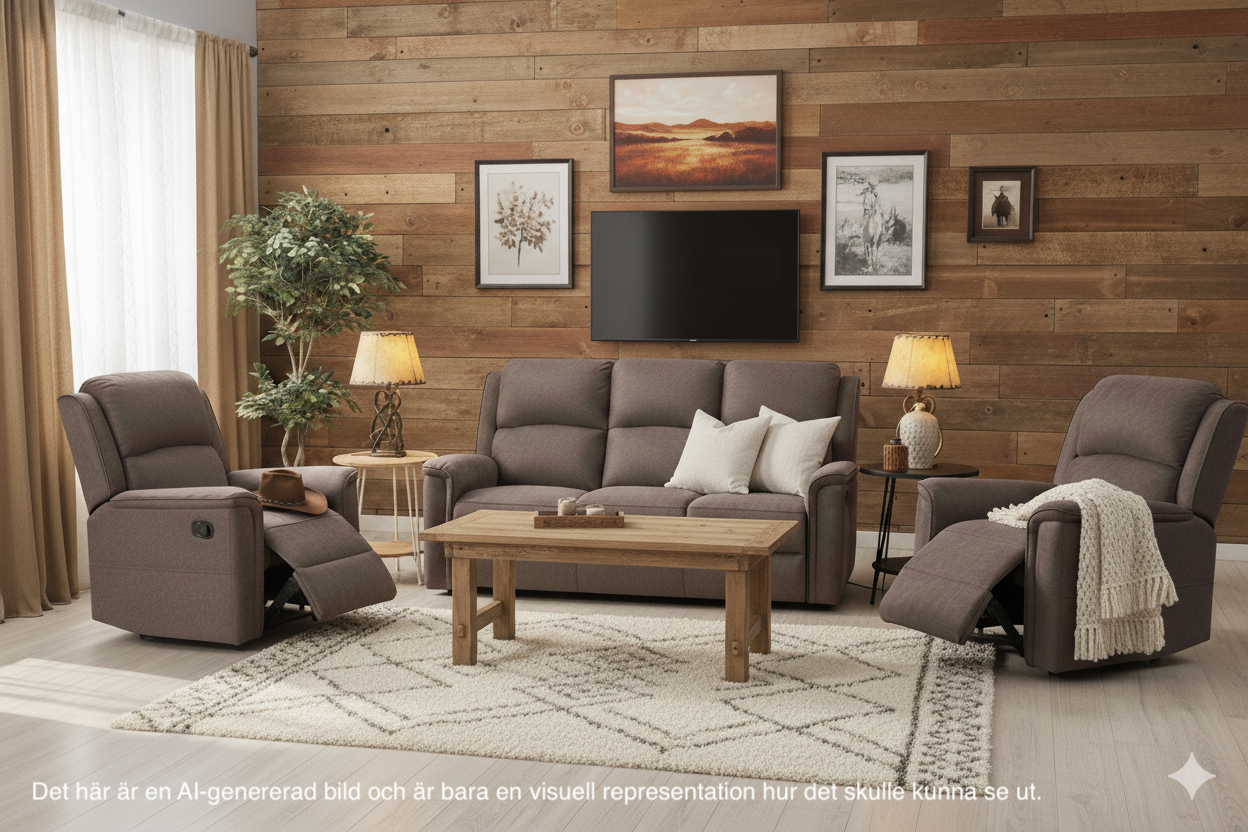 Upptäck STAFFAN Reclinergrupp – en elegant och bekväm sittgrupp från NFG Sverige som består av 1 st 3-sitssoffa och 2 st fåtöljer, alla klädda i mjukt brunt tyg. Både soffan och fåtöljerna har manuell reclinerfunktion som gör det enkelt att luta sig tillbaka och koppla av.