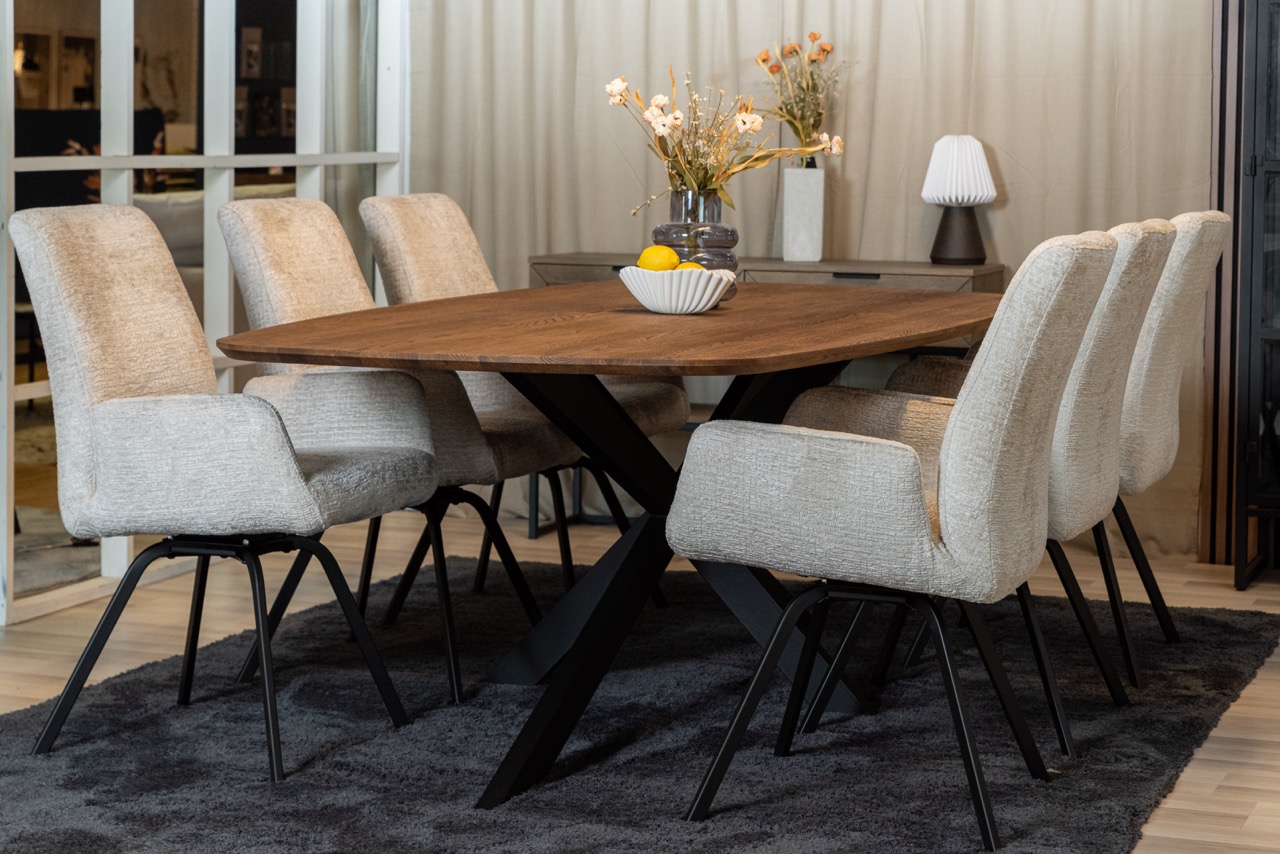 Här visas Atalanta Matbord i exklusiv rökt ek, som framhäver träets naturliga ådring och skapar en varm, inbjudande atmosfär. Den unika bordsskivan kombineras med en stilren, svart metallunderrede i korsformad design, vilket ger en stabil grund och en modern touch.