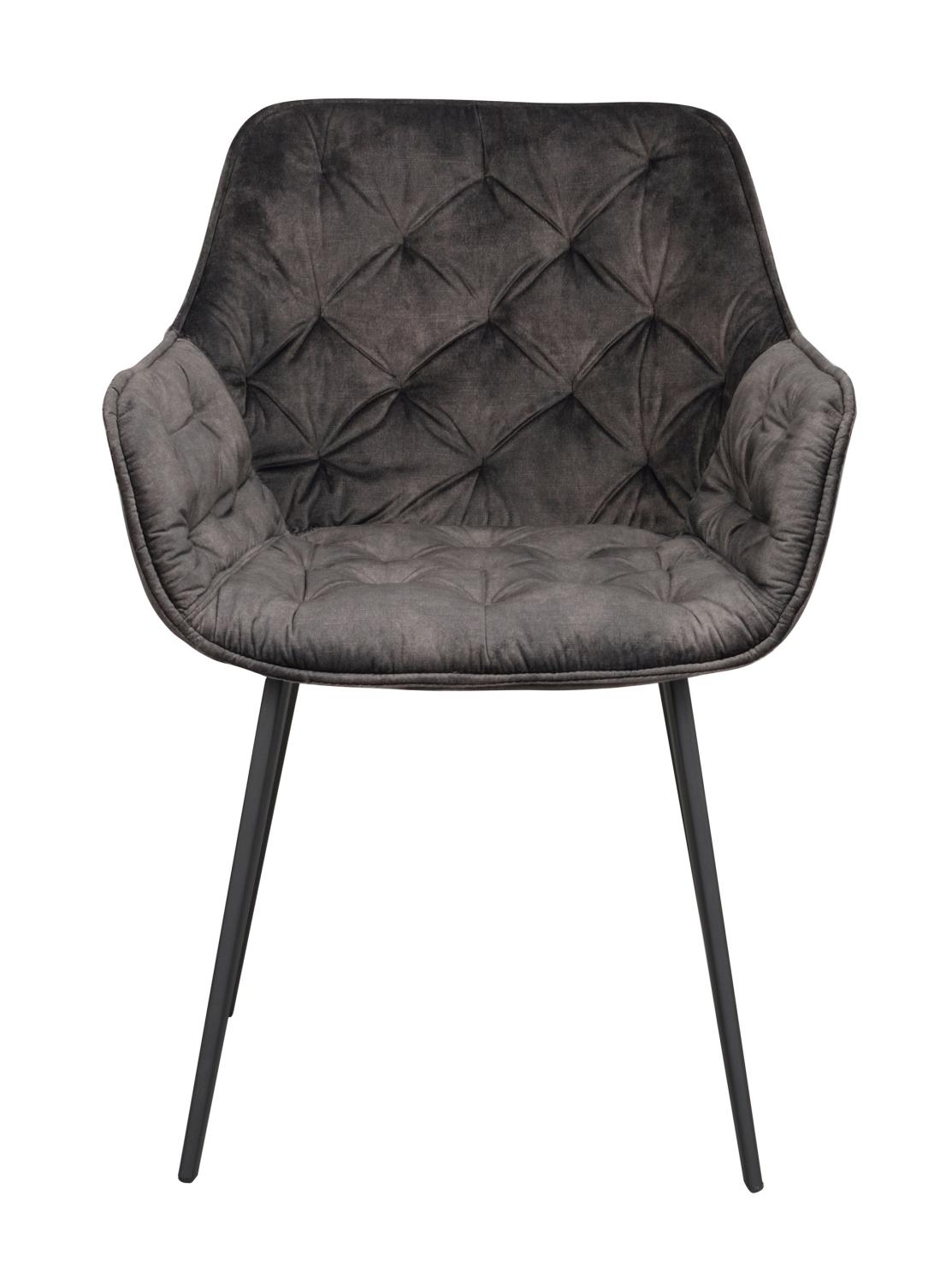 Gilroy karmstol är en exklusiv stol i lyxigt beige eller grått sammetstyg med dekorativt mönster och med svarta tåliga pulverlackade metallben. Stolen har en stoppad sits med djuphäftade detaljer och är oerhört komfortabel att sitta i. Säljs endast i 2-pack.