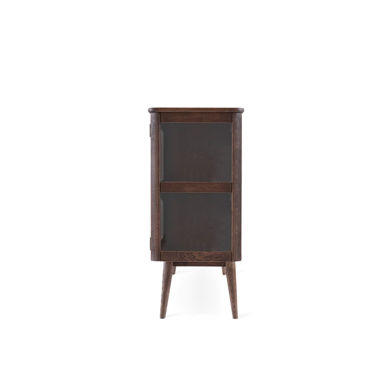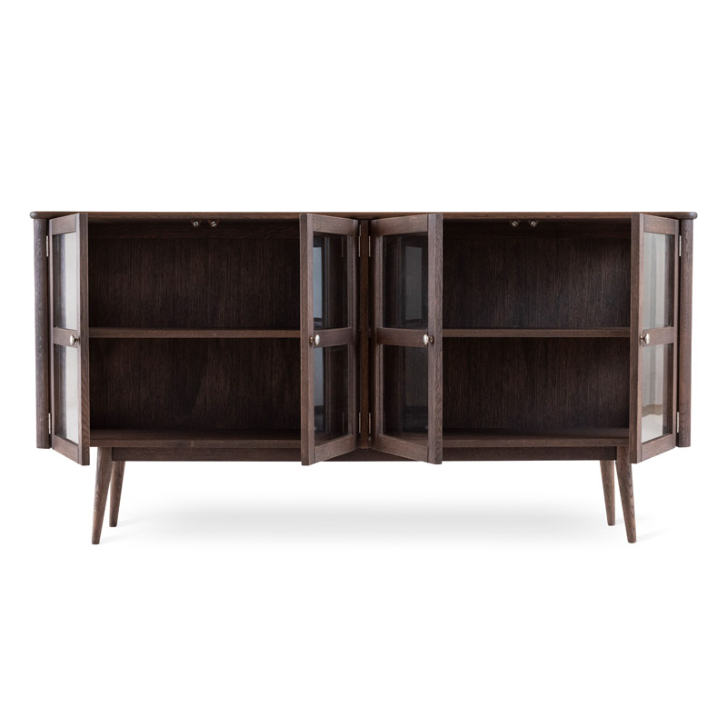 Löderup sideboard vitrin i fanerad/massiv rökoljad ek med smakfulla detaljer som svarvade ben, rundad kant på toppskiva och runda hörn. Produkten har två par vitrindörrar med ett trähyllplan bak varje dörrpar