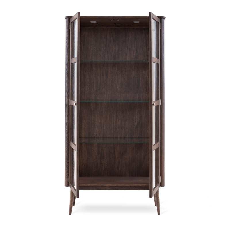 Löderup vitrinskåp i fanerad/massiv rökoljad ek med smakfulla detaljer som svarvade ben, rundad kant på toppskiva och runda hörn. Produkten har två vitrindörrar och tre glashyllplan som ger möjlighet till stor förvaring. Medföljande belysning ger produkten ytterligare värde.